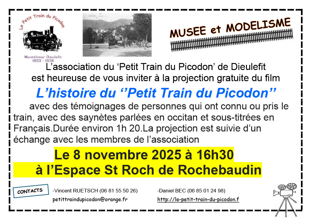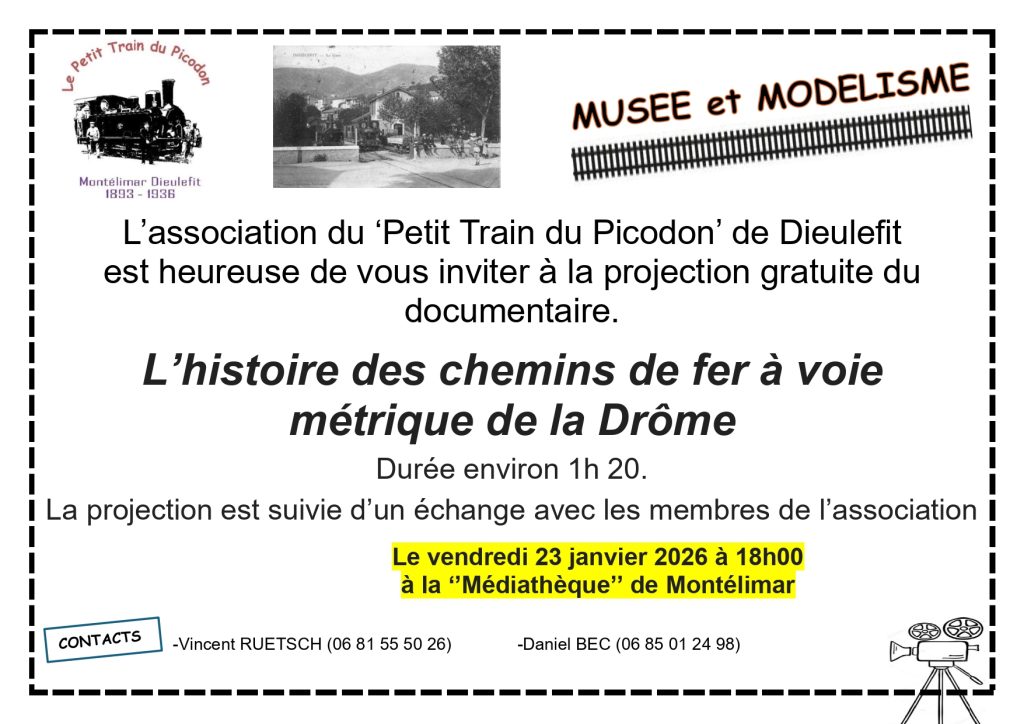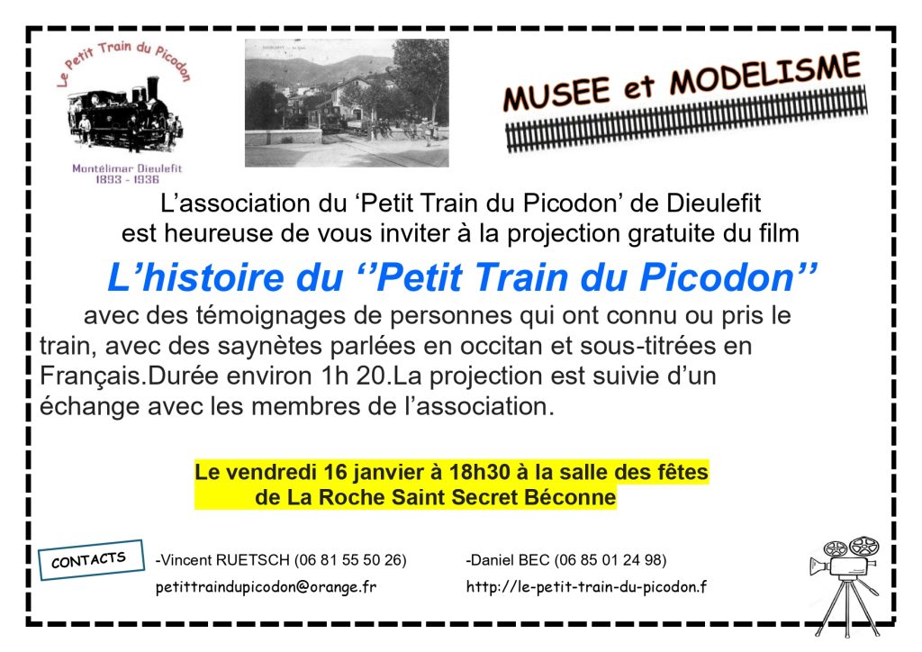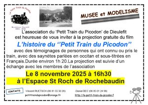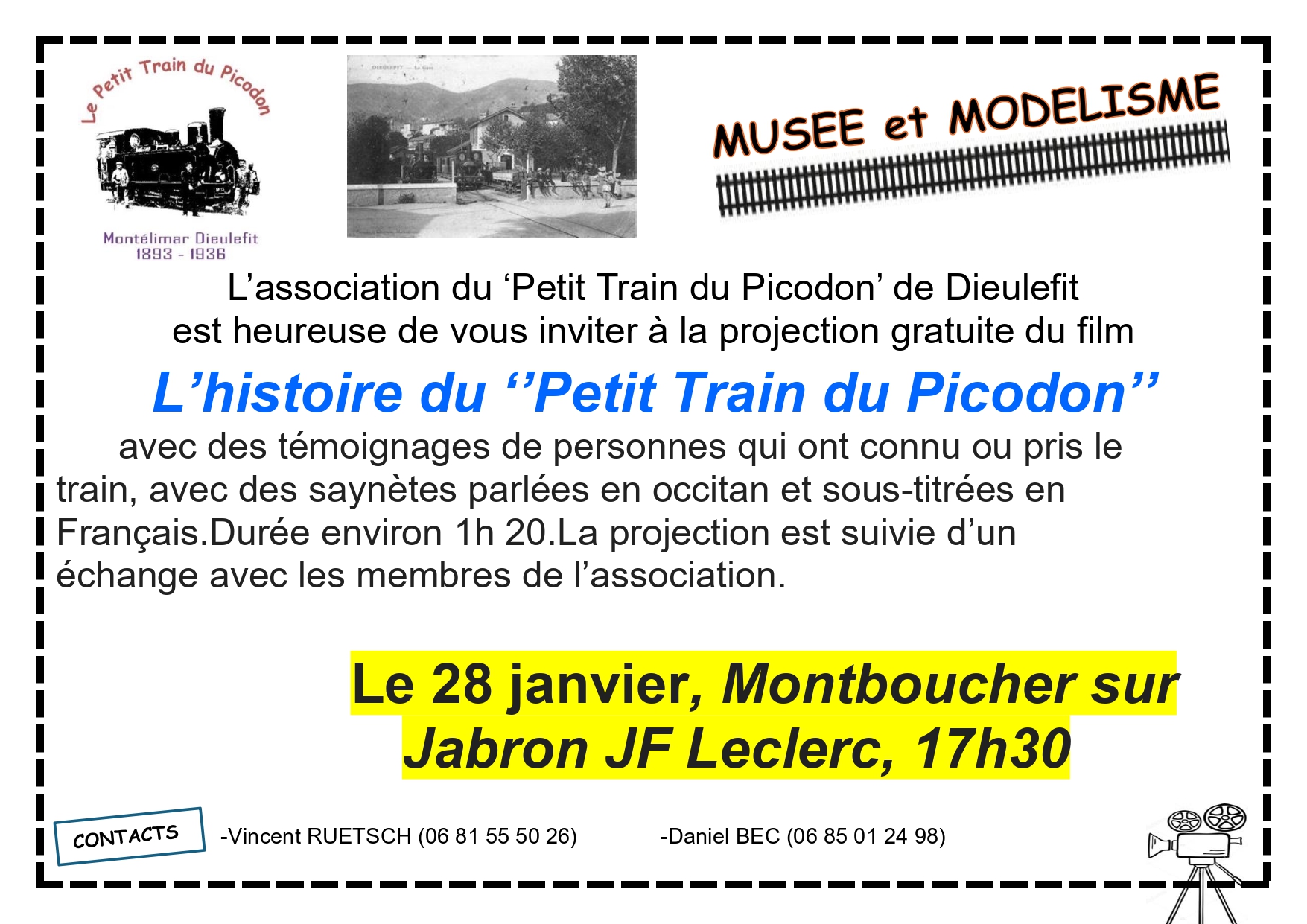 Manifestations Projection 8 novembre à 16h30, Espace Saint Roch de Rochebaudin Stage ARDUINO et création figurines Samedi 17 mai Picodon chez lui Du 10 au 11 août 2024 Espace de la Gare Dieulefit Exposition de Modélisme Ferroviaire 2 et 3 Novembre 2024 Gymnase Juncher Forum des Associations 7 Septembre à Montélimar 14 Septembre à Dieulefit Visite de la Gare Pendant tout l'été vous pouvez visiter la gare. Exposition permanente photographique du petit train, objets divers. Samedi de 9h à 12h et de 14h à 17h. Dimanche de 14h à 17h Journées Européennes du Patrimoine Un film sur les tramways de la Drôme Les tortillards oubliés de la Drôme : une histoire des petites lignes de chemin de fer.