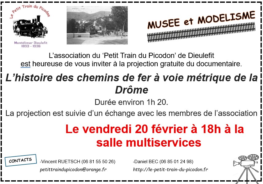 Manifestations ANNÉE 2026 Projection Vendredi 20 févirer à 18h Salle multiservice de Puygiron Projection Le mercredi 28 janvier à 17h30, à Montboucher sur Jabron salle JF leclerc Projection Le Vendredi 23 Janvier 2026 à 18h00, à la Médiathèque de Montélimar Projection Le 16 Janvier 2026 à 18h30, Salle des fêtes de La Roche Saint Secret Béconne ANNÉE 2025 Projection 8 novembre à 16h30, Espace Saint Roch de Rochebaudin Stage ARDUINO et création figurines Samedi 17 mai ANNÉE 2024 Picodon chez lui Du 10 au 11 août 2024 Espace de la Gare Dieulefit Exposition de Modélisme Ferroviaire 2 et 3 Novembre 2024 Gymnase Juncher Forum des Associations 7 Septembre à Montélimar 14 Septembre à Dieulefit Visite de la Gare Pendant tout l'été vous pouvez visiter la gare. Exposition permanente photographique du petit train, objets divers. Samedi de 9h à 12h et de 14h à 17h. Dimanche de 14h à 17h Journées Européennes du Patrimoine Un film sur les tramways de la Drôme Les tortillards oubliés de la Drôme : une histoire des petites lignes de chemin de fer.